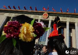3月5日,第十二屆全國(guó)人民代表大會(huì)第二次會(huì)議在北京人民大會(huì)堂開(kāi)幕。云南少數(shù)民族代表在進(jìn)入會(huì)場(chǎng)前合影留念。中新社發(fā) 駱云飛 攝