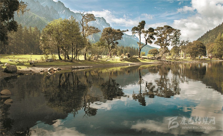 “江”與“湖”,靜臥于原始森林與草甸花海的之間,河溪清澈,湖水湛藍,真如秘密花園,人間仙境。湖畔最美的是盤根錯節(jié)的老柏樹,枝條彎曲如蒼龍,或立于湖畔,或臥于湖中,滿湖樹影、花影隨風(fēng)搖曳。