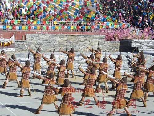 10月26日,在甲居藏寨,處處洋溢著豐收和歡樂(lè)的氣氛,人們扶老攜幼,身著節(jié)日的盛裝走到一起,來(lái)共同慶祝丹巴嘉絨風(fēng)情節(jié)的順利召開(kāi)。在一塊空地中,搭建了臨時(shí)的舞臺(tái),看臺(tái)上,幾座古碉模型傲然挺立,在不遠(yuǎn)處,一座古碉矗立在一座小山包上,與古碉模型遙相呼應(yīng)、相映成趣。上午9時(shí)40分,當(dāng)節(jié)目主持人宣布嘉絨風(fēng)情節(jié)正式開(kāi)始時(shí),一束束搖曳的煙花向空中飛去,在空中炸響后,散發(fā)出五顏六色的煙霧,其中有的還幻化成幾多小小的降落傘,就像多多盛開(kāi)的鮮花在空中綻放。演出現(xiàn)場(chǎng)前的大地和遠(yuǎn)處的小山坡上到處都站滿了熱情的觀眾,合著禮花的爆裂時(shí)的響聲,將手中的小紅旗展開(kāi),高舉過(guò)頭頂,有節(jié)奏的左右搖動(dòng),霎時(shí)間,整個(gè)現(xiàn)場(chǎng)成為了紅色的海洋。