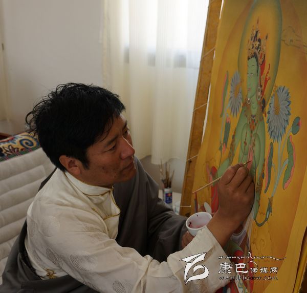 “如此工藝精細(xì)、筆法工整的繪制過(guò)程,必然注定價(jià)值的與眾不同。”記者話音未落,他便迫不及待地加以了例證:“比如,要繪制一幅長(zhǎng)1.25米、寬1米的‘多派唐卡’,需要有近百個(gè)佛像,最小的佛像頭部只有指甲蓋大小,筆觸要求非常細(xì)膩,哪怕每天都堅(jiān)持畫(huà)十幾個(gè)小時(shí),至少也要一年多時(shí)間來(lái)才能完成。由于題材從宗教轉(zhuǎn)向世俗、審美從傳統(tǒng)走向現(xiàn)代、技法從圖像制作走向藝術(shù)創(chuàng)造,唐卡作為‘藏密文化’的概念正逐漸被世人所知,并成為唐卡藝術(shù)品市場(chǎng)上的寵兒。2012年3月18日,我和一級(jí)唐卡畫(huà)師丁嘎創(chuàng)作的《五度母像》長(zhǎng)幅唐卡以168萬(wàn)元的高價(jià)被收藏者購(gòu)買,創(chuàng)下了‘多派唐卡’最高售價(jià)紀(jì)錄,‘多派唐卡’也因此成了公眾與輿論關(guān)注的熱點(diǎn)和焦點(diǎn)。”