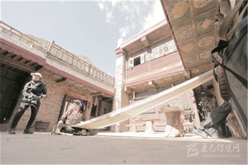 藍(lán)藍(lán)的天空下,成群的牦牛散落在草場(chǎng)上吃草。在一派祥和的氣氛中,傳來(lái)一陣清亮的歌聲。拉姆的媽媽和哥哥扎西,正在腌制著香豬腿。