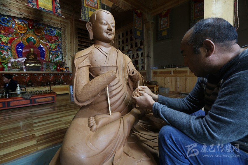 見(jiàn)到克村時(shí),他正在鄰村一農(nóng)戶的經(jīng)堂里制作佛像,盤坐在蓮花寶座上的宗喀巴大師和兩個(gè)弟子身披袈裟手持經(jīng)書的泥塑作品神形兼?zhèn)洌@是克村和徒弟多登近半個(gè)月的心血。克村坐在布?jí)|上,心無(wú)旁騖神情專注地,用木制工具對(duì)作品進(jìn)行打磨,旁邊擺放著一盆清水和一筐自制的工具。