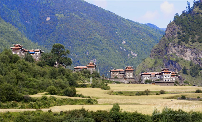 藏寨從大金河谷層層疊疊向上攀緣,在相對(duì)高差近千米的山坡上,一幢幢藏式樓房或星羅棋布,或稠密集中,錯(cuò)落有致。不時(shí)炊煙裊裊、云霧繚繞,詩情畫意。