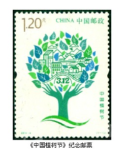 2019年是中國的植樹節(jié)設(shè)立40周年。3月12日,中國郵政發(fā)行一枚《中國植樹節(jié)》紀(jì)念郵票。郵票畫面以綠色為基調(diào),圖案主體為雙手托起的綠色家園,手臂代表樹干、張開的五指代表樹枝,寓意大家親自動手,植樹造林,為改善生活環(huán)境做出一份貢獻,同時也寓意人類是肩負(fù)改善地球環(huán)境重任的主要力量。樹干枝頭上方是生機盎然的綠葉,層層綠葉中設(shè)計點綴了象征城鎮(zhèn)、鄉(xiāng)村、河流、山川、藍天白云、飛鳥的符號化圖形,寓意通過全民植樹造林活動,改善生態(tài)和生活環(huán)境,共同創(chuàng)造綠水青山的美麗中國。