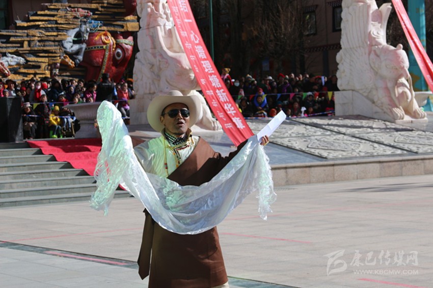 吉祥頌,藏語稱為“協(xié)巴”,是州級非物質文化遺產之一。“協(xié)巴”在藏族民間生活中占有重要的地位,尤其在喜慶活動上,是一項不可或缺的重要儀式。州級非物質文化遺產傳承人——高城鎮(zhèn)車馬村的翁堆老人手捧潔白的哈達,為觀眾表演了《協(xié)巴——中國夢、理塘夢》,展現(xiàn)了時代變遷中,“吉祥頌”這一民間藝術在思想內容和藝術手法的創(chuàng)新之美。