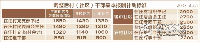 省上明確,此次村(社區(qū))干部基本報(bào)酬標(biāo)準(zhǔn)為最低補(bǔ)助標(biāo)準(zhǔn),各地可根據(jù)經(jīng)濟(jì)發(fā)展水平、城鄉(xiāng)居民收入狀況和工作需要進(jìn)行適當(dāng)增加調(diào)整,重點(diǎn)對村人口在3000人以上、高寒高海拔地區(qū)工作的提高補(bǔ)助標(biāo)準(zhǔn);對跨村兼職和兼任組干部的提高報(bào)酬待遇。各地要進(jìn)一步完善村(社區(qū))干部基本報(bào)酬激勵保障機(jī)制,繼續(xù)推行“固定報(bào)酬+績效報(bào)酬”制度,強(qiáng)化考評激勵,充分調(diào)動村(社區(qū))干部干事創(chuàng)業(yè)活力。