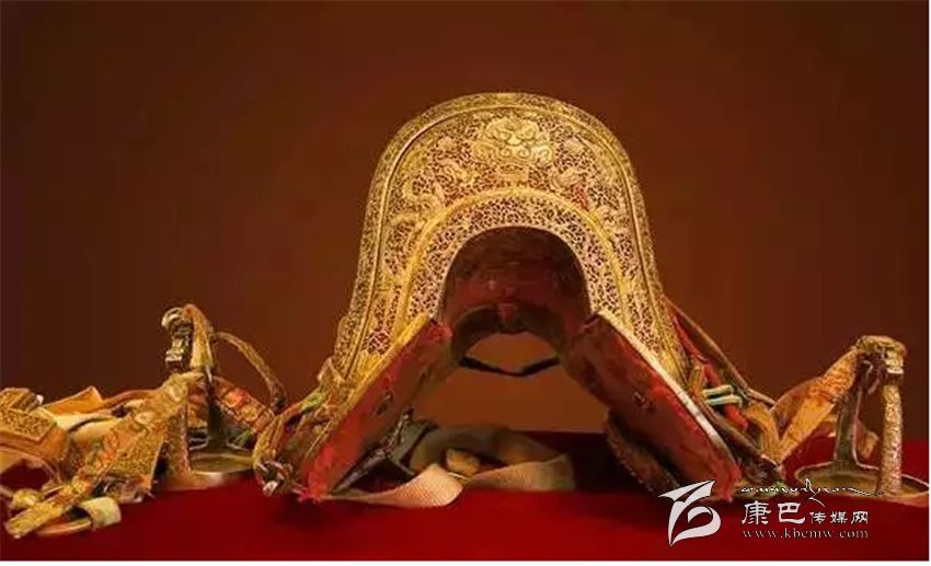 能工巧匠們在馬鞍前后和馬鐙上的鏤空雕花中撰刻下百條栩栩如生的龍紋,與精巧的金色馬鞭相映成趣。