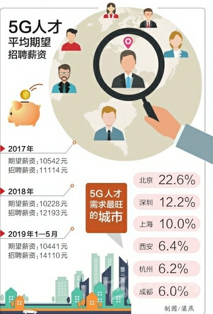 數(shù)據(jù)顯示,今年1—5月,5G相關(guān)人才平均招聘月薪為14110元,較2018年平均月薪水平高出15.7%,其增幅較2018年高出6個(gè)百分點(diǎn)。3年來,企業(yè)的5G人才招聘預(yù)算在逐年增高,平均招聘月薪大幅上漲,但求職者的平均期望薪資卻一直低于平均招聘薪資。相較于此前運(yùn)營商官方表述的“2020年5G正式商用”時(shí)間表,工信部將5G牌照至少提前了半年發(fā)放。5G的提前商業(yè)化和激烈的競爭使得企業(yè)對(duì)于相關(guān)人才的需求更加的迫切,從不斷飆升的平均招聘月薪中可見一斑。