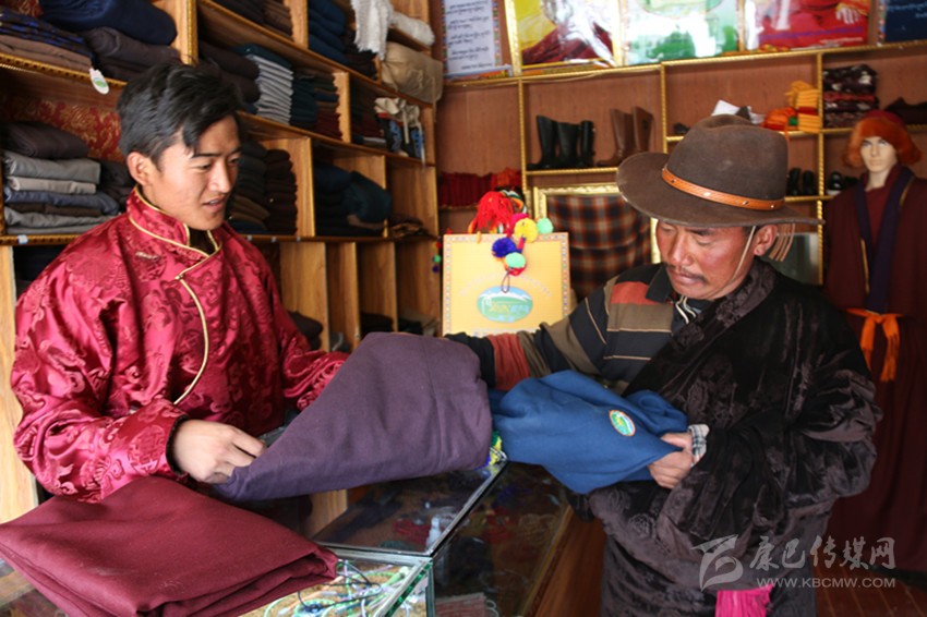安孜鄉(xiāng)作為白玉縣海拔較高的鄉(xiāng)鎮(zhèn)之一,夏天是十分短暫的,連日來的晴好天氣,也透著絲絲寒氣。牧民阿剛想要量身定做一套過冬的藏裝,8月26日,他來到白玉縣阿察鎮(zhèn),一家民族服飾商貿(mào)公司吸引了他的目光?!拔覀冞@里的服裝面料是本地羊毛和從浙江進(jìn)的上等面料,做工考究,很多工序是純手工制作,服裝樣式你可以根據(jù)你的喜好指定,我們包你滿意?!钡陠T仁真熱情地介紹。聽了仁真的介紹,阿剛用手捻了一下服裝用料的質(zhì)地,看到印有“祥陽措”商標(biāo)的精美包裝袋,商店里擺放的五彩斑斕、高端大氣的藏式男女服裝,他有些動(dòng)心了?!吧a(chǎn)這些服裝的都是我們納塔鄉(xiāng)的牧民,你可以考察我們的服裝用料、生產(chǎn)流程,再作打算?!比收鏌崆檠笠绲亟榻B說。