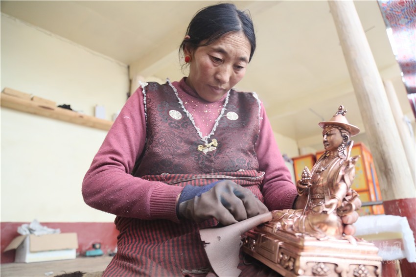 一雙粗糙而靈巧的手正一絲不茍地對(duì)銅像進(jìn)行最后的打磨。這是一雙執(zhí)著于銅鑄工藝43年的手。尼瑪從7歲開始學(xué)習(xí)銅鑄手藝,是該項(xiàng)工藝的州級(jí)非物質(zhì)文化傳承人。
