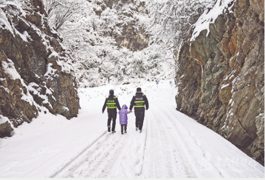 晨間,山谷滿是積雪,氣溫已降至零下。看到頂風(fēng)冒雪如期而至的民警,原本又驚又怕的受困游客看到了希望。柯金貴和戰(zhàn)友們一方面安撫他們,另一方面合力將事故車輛移開,并帶領(lǐng)受困人員安全離開事發(fā)區(qū)域。
