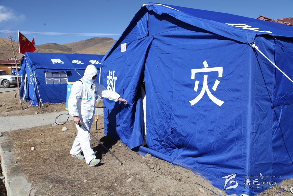 在離武警武警四川總隊二支隊的醫(yī)務(wù)站不遠(yuǎn)的地方,新都橋中心衛(wèi)生院的衛(wèi)生員羅衛(wèi)強(qiáng)正“全副武裝”的為每一頂帳篷做著消毒。羅衛(wèi)強(qiáng)說:“我們從地震第一天到現(xiàn)在一直堅守在一線,22日到26日都在祖慶小學(xué)進(jìn)行消毒工作,27日和其他工作人員換班到了江巴牧民新村安置點(diǎn)。我們每天會早上一次,晚上一次對每一間帳篷進(jìn)行兩次消毒。除了我們,康定縣疾控中心的工作人員還會每天進(jìn)行一次消毒,我們都在盡最大的努力保證牧民生活環(huán)境的衛(wèi)生。”在對環(huán)境進(jìn)行消毒后,他又來到醫(yī)療就助點(diǎn)為前來就醫(yī)的甲瑪它看起病來。