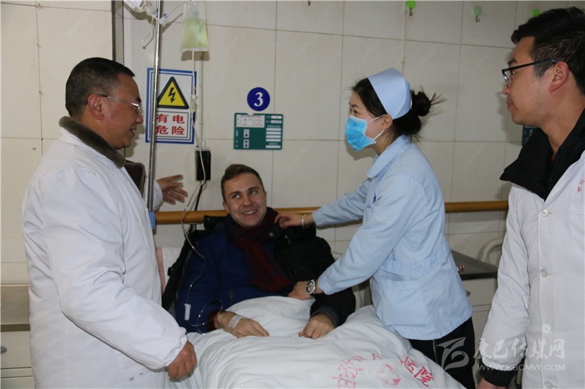 和國醫(yī)生正在給臨床病人檢查病情。一位來康定玩的俄羅斯小伙因患重感冒住進了急救中心。正在輸液的他用比較熟練的中文激動地告訴記者:“這里的醫(yī)生服務很好,他們過年都沒有休息,我得了重感冒,經(jīng)過治療以及在他們的細心關照下,我的病情好多了?!?/span>