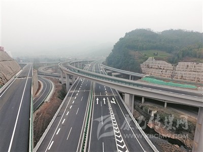 道路兩旁山嶺逶迤,觸目所見的高速公路,幾乎全都搭建在山腰帶際之間,如同蒼山綠水上的一條“彩練”。山河與路橋隧的錯落有致,車上的人便更有一種與藍天白云的距離越來越近的錯覺。沿線綠化因地制宜,打造水體山體景觀,“車在路上行,路在景中生,人在畫中游”的美感油然而生。