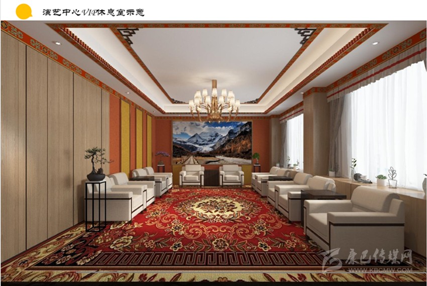 藏式繪畫、門板藏式浮雕造型、藏式鼓架、展示康定城的浮雕........記者看到,效果圖中農(nóng)牧民演藝中心的設(shè)計充滿了“傳統(tǒng)文化”的味道。頂部設(shè)計利用了線條的柔韌性和律動性,使空間更有線條感,看起來像康定的潺潺河流,墻面分別使用樂器、山巒疊成的變化形式,營造出獨特的民族風情。通過自熱和人文的結(jié)合展示出康定人民樂觀向上、民族團結(jié)的和樂畫面。地面設(shè)計采用了暖(冷)色座椅與富有民族特色的色彩搭配,營造出一種身處藏家,暢游藏文化海洋的意境。